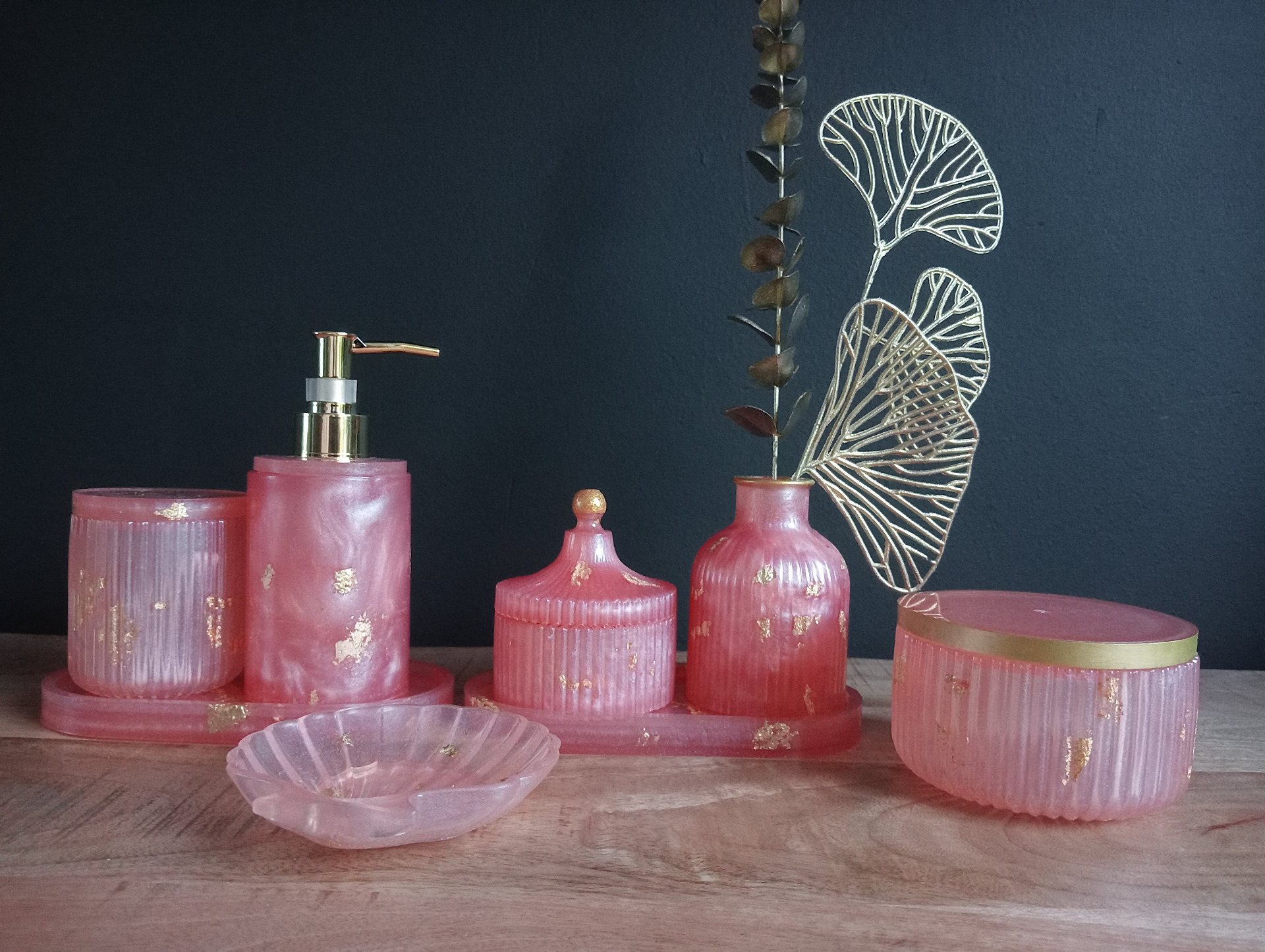 Wattenschijfbakje met schelp voor sieraden, opbergbakje en zeeppompje op tableau,