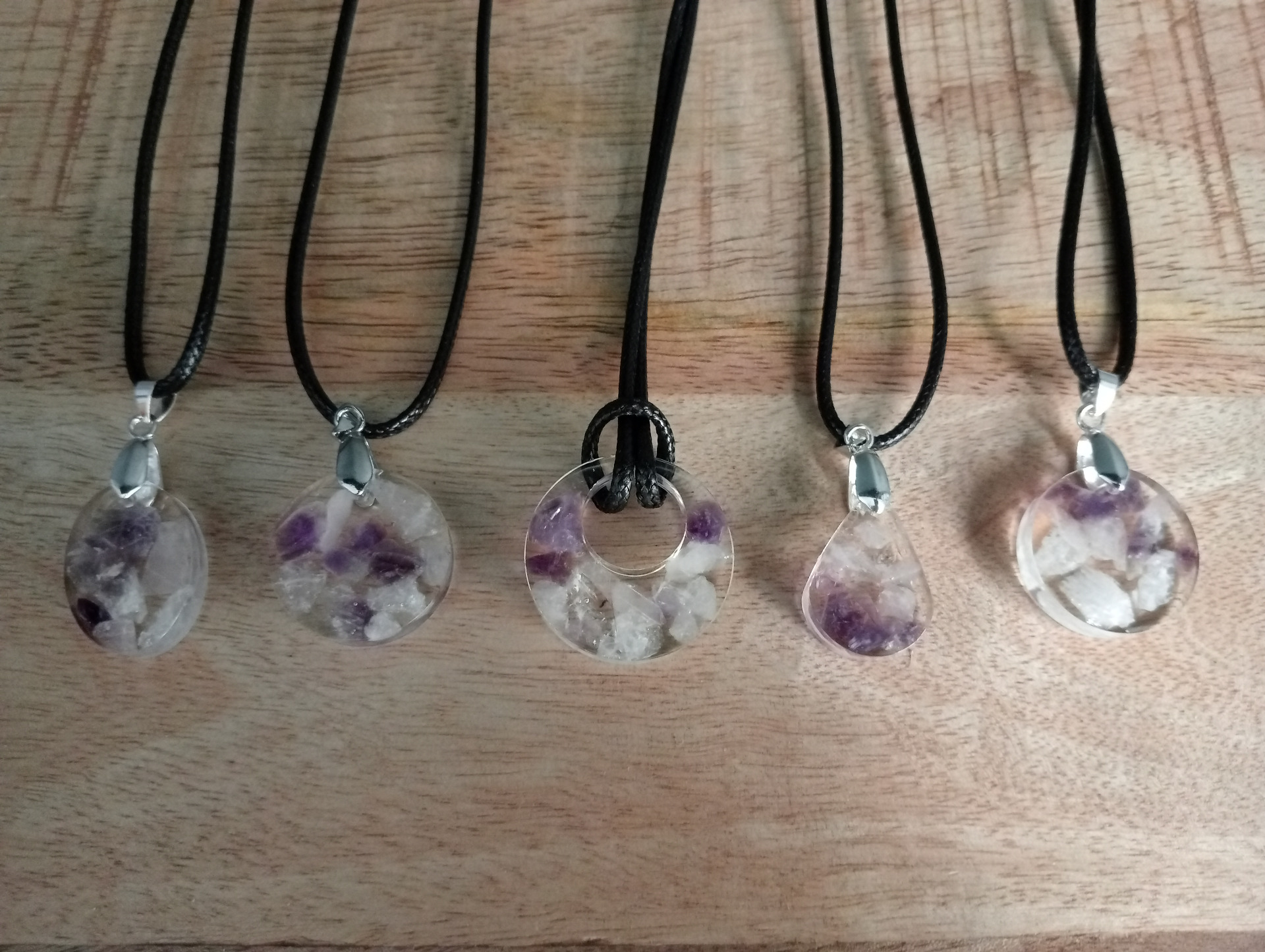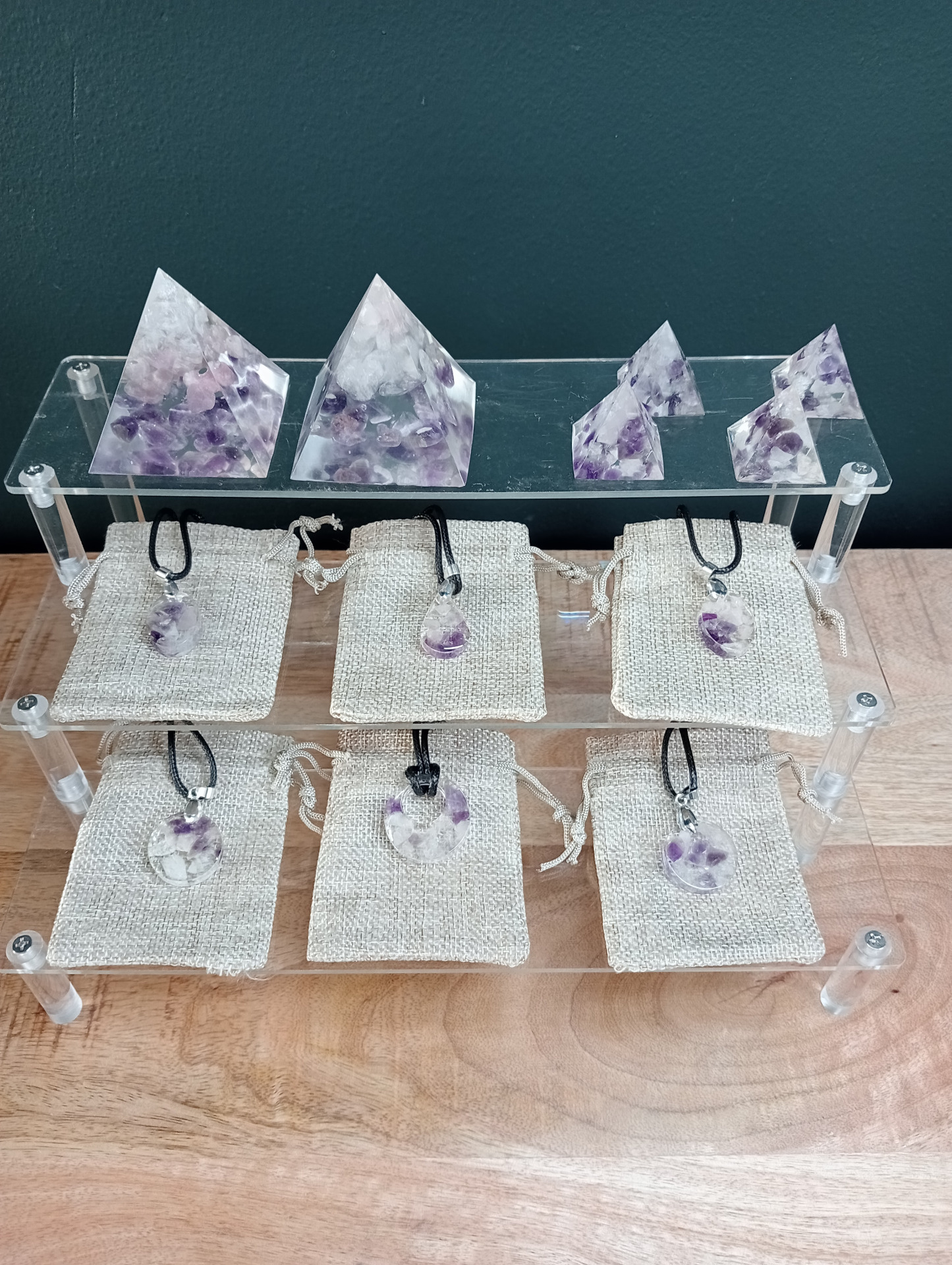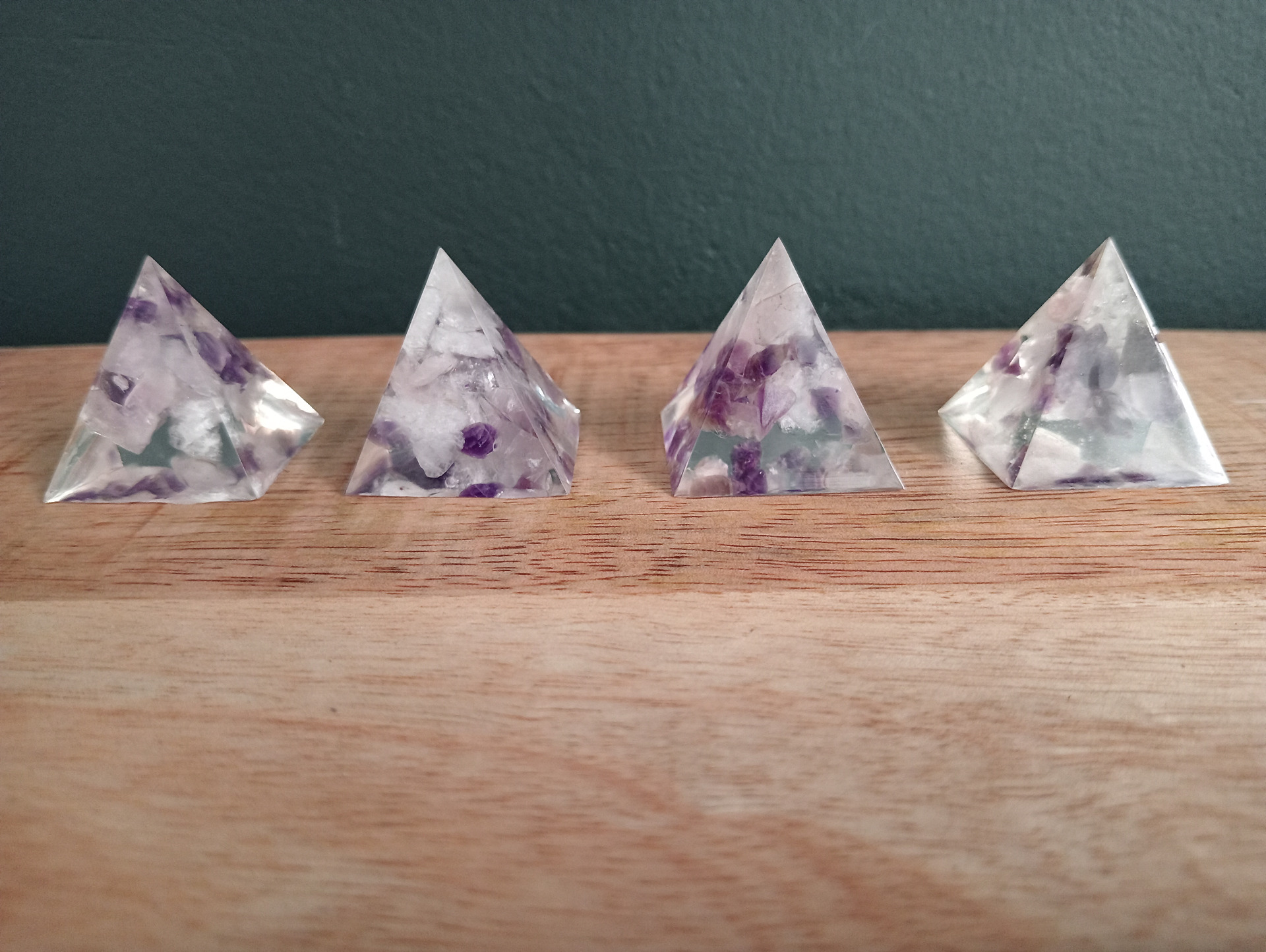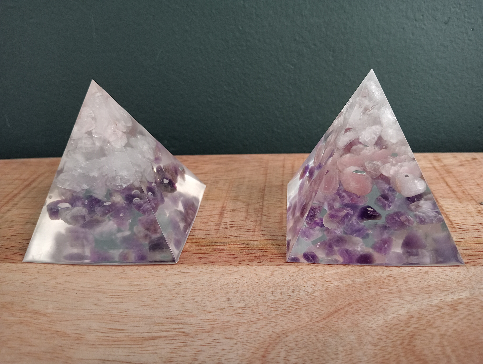 Gouden driehoek bestaat uit 3 kristallen: Bergkristal, Rozenkwarts en Amethist.